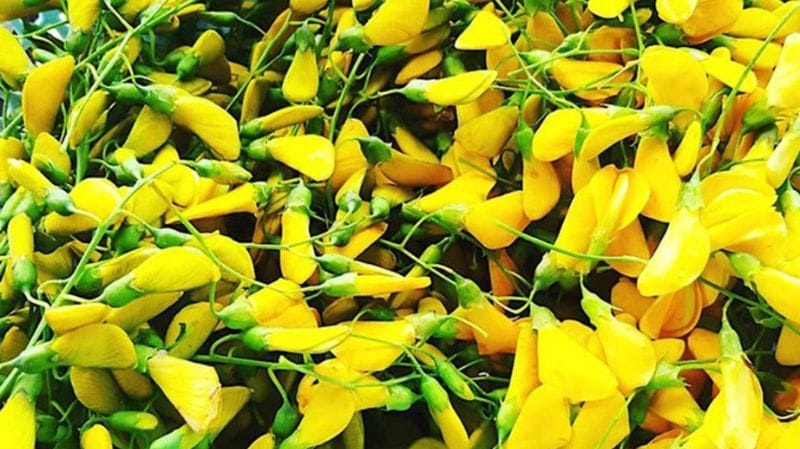 Bông điên điển thường mọc ở đầm lầy, ruộng nước, có hoa vàng và quả đậu, là nguyên liệu tự nhiên, giàu dinh dưỡng, đặc trưng ẩm thực miền Tây Nam Bộ.